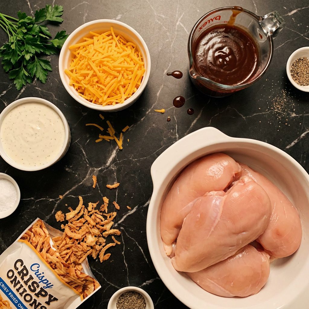 The combination of smoky BBQ sauce and creamy ranch dressing creates a sauce that is genuinely addictive. It’s sweet, tangy, rich, and savory all at once — and it soaks into the chicken while it bakes, keeping every bite incredibly juicy. The melted cheddar on top gets golden and bubbly, and those crispy fried onions on top? They stay crunchy the whole way through and give you that incredible texture contrast that makes this dish so satisfying.
