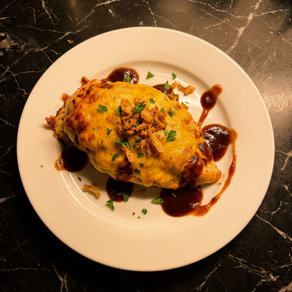 No cheddar? Monterey Jack, pepper jack, or mozzarella all melt beautifully here. If you don’t have crispy fried onions, toasted panko breadcrumbs mixed with a little melted butter make a great crunchy topping. For a spicier version swap the regular BBQ sauce for a chipotle or spicy variety. Chicken thighs work just as well as breasts — they’re actually juicier and more forgiving in the oven.