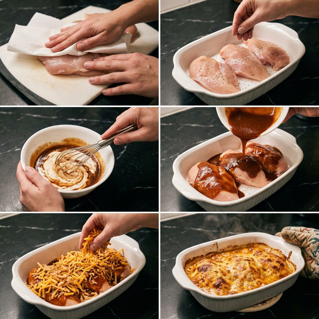 Pat the chicken breasts completely dry with paper towels — this helps the sauce stick properly. Place them in the baking dish and season both sides generously with salt and black pepper. Don’t skip this step even with all the flavorful sauce coming — the seasoning underneath makes a real difference.