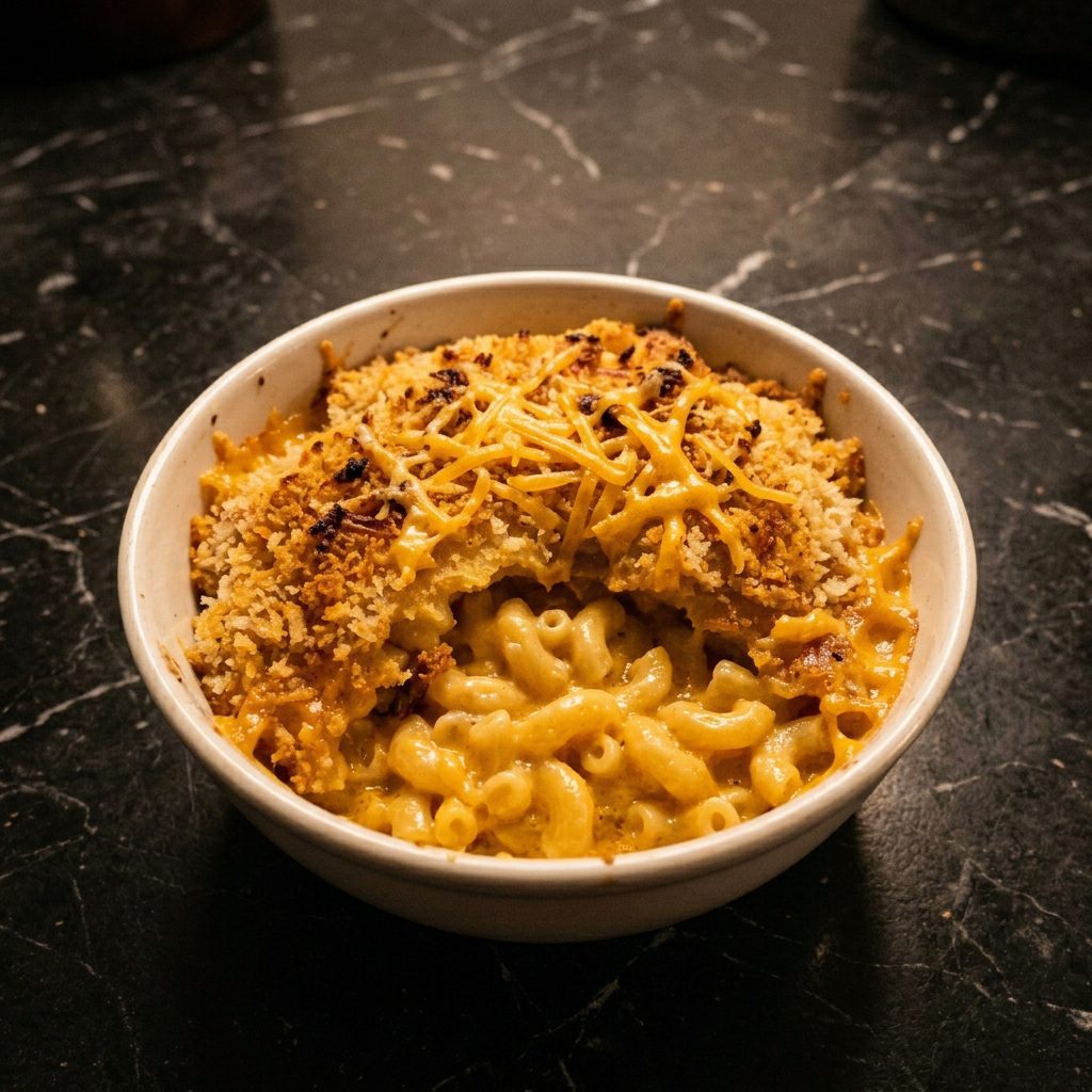 In a small bowl combine the panko, melted butter, garlic powder, and pinch of salt. Stir until the panko is fully coated and golden. Scatter the topping evenly across the entire surface of the macaroni — every inch should be covered for maximum crunch. Place in the preheated oven and bake for 20 to 25 minutes until the topping is deep golden brown and the cheese sauce is bubbling at the edges. The top should look incredibly golden and crunchy. Rest 10 minutes before serving.