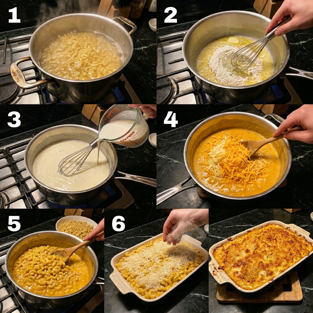 The sauce is everything — and this one is a masterpiece. A classic butter and flour roux enriched with whole milk, heavy cream, sharp cheddar, and Parmesan creates a sauce that is silky, rich, and deeply cheesy without being heavy or gluey. The secret is using two different cheeses for complexity and always adding them completely off the heat — this keeps the sauce perfectly smooth instead of grainy. The sauce is intentionally extra saucy when you add the pasta because it thickens further in the oven — and you end up with macaroni that is creamy all the way through, never dry.