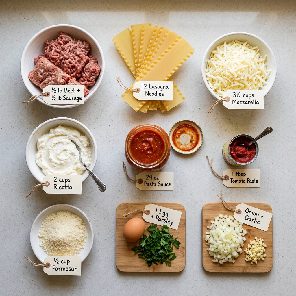 All ground beef works if you don’t have sausage — add ½ teaspoon of fennel seeds and an extra pinch of Italian seasoning to the beef to approximate the flavor. Cottage cheese can replace ricotta for a more budget-friendly version — drain it well first. For a vegetarian version replace the meat with diced mushrooms, zucchini, and spinach sautéed in olive oil with the same seasonings. No-boil lasagna noodles work but give a slightly different texture — reduce baking time by 10 minutes and add ¼ cup extra sauce to ensure they cook through.