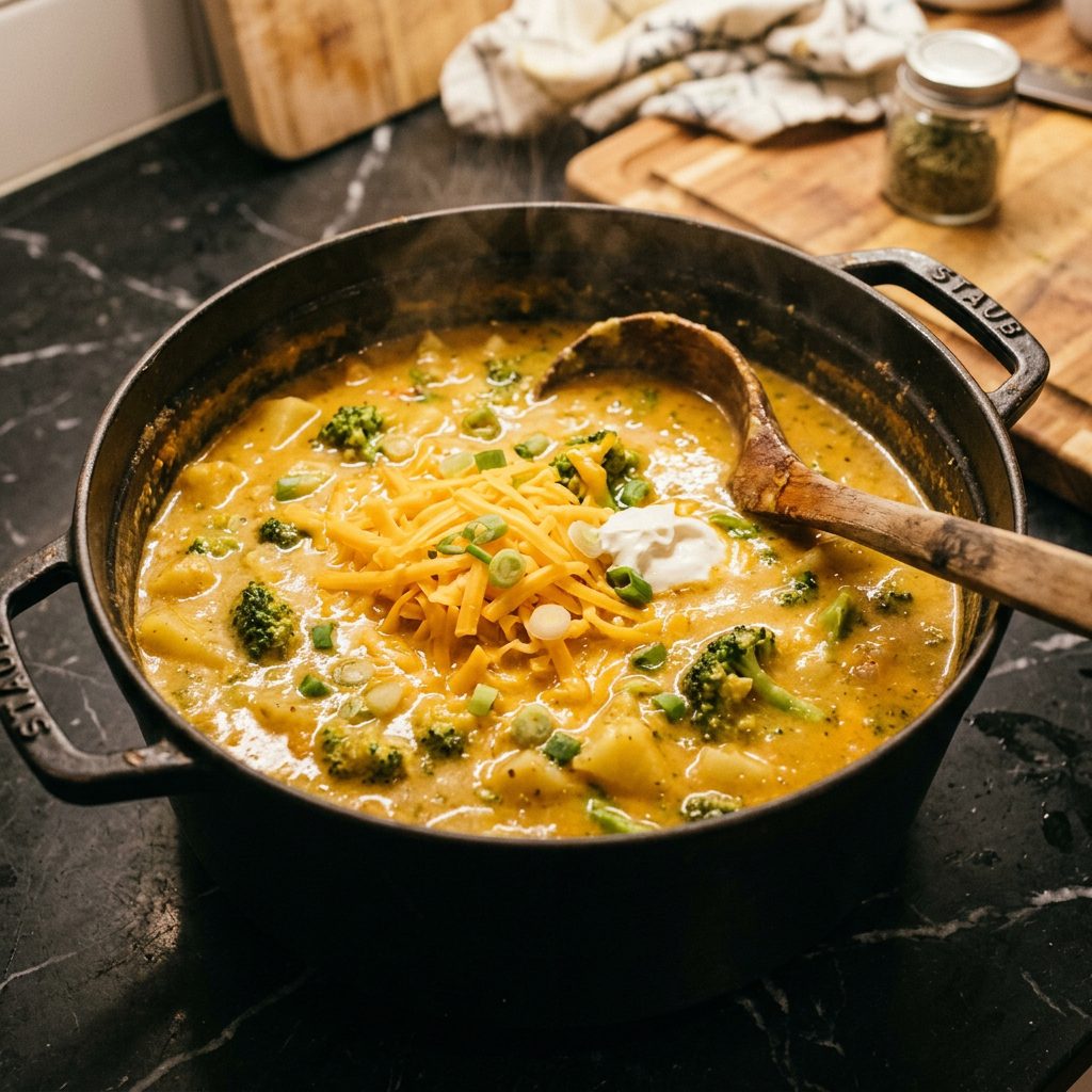 This cheesy broccoli potato soup is the bowl I make when I want something that feels completely indulgent but comes together in 35 minutes on a single pot. Tender potato chunks and fresh broccoli florets simmered in a rich savory broth, then loaded with a generous amount of sharp cheddar that melts into the most velvety creamy soup base you’ve ever had. This cheesy broccoli potato soup is the kind of recipe that makes the whole kitchen smell incredible and has everyone asking what’s cooking from the other room. At Golden Recipes it’s become my go-to cozy soup for cold nights — thick, cheesy, completely satisfying, and endlessly customizable with whatever toppings you love.