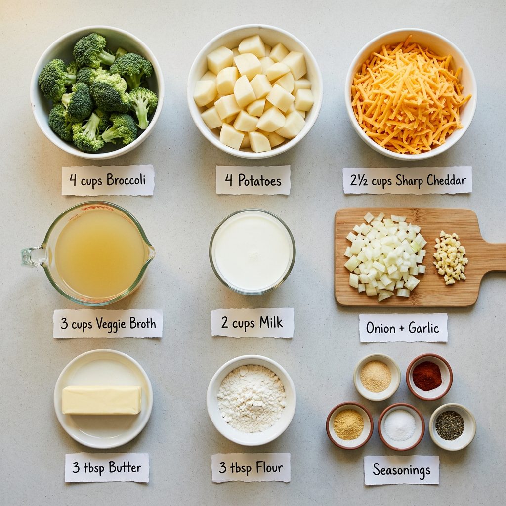 The combination of potatoes and broccoli in a cheddar soup is genuinely one of the most satisfying flavor combinations in all of comfort food cooking. The potatoes give the soup its incredible thick hearty body — as they cook they release starch that naturally thickens the broth without needing a heavy roux. The broccoli adds a fresh slightly earthy flavor and a beautiful color contrast against the golden orange cheddar broth. And the sharp cheddar — added at the end off the heat — melts into something silky and luxurious that coats every piece of vegetable and every spoonful.