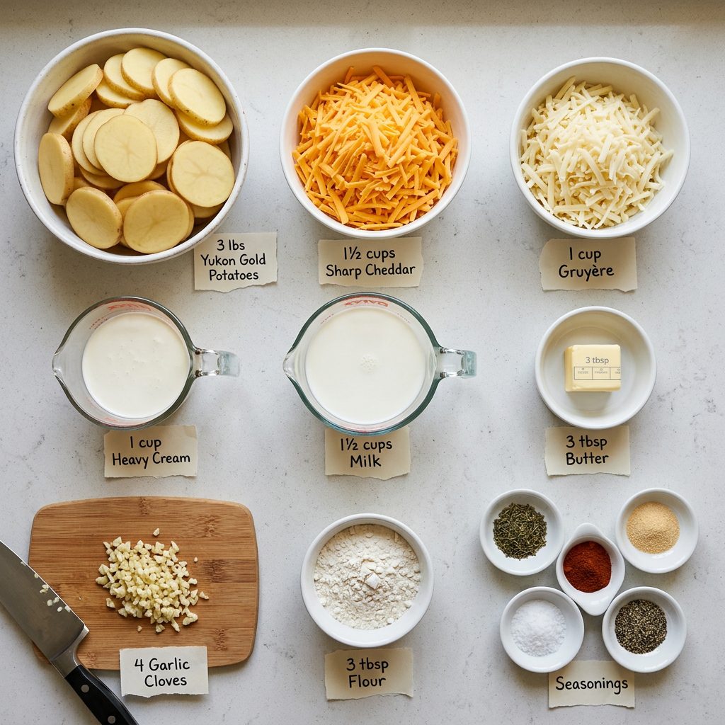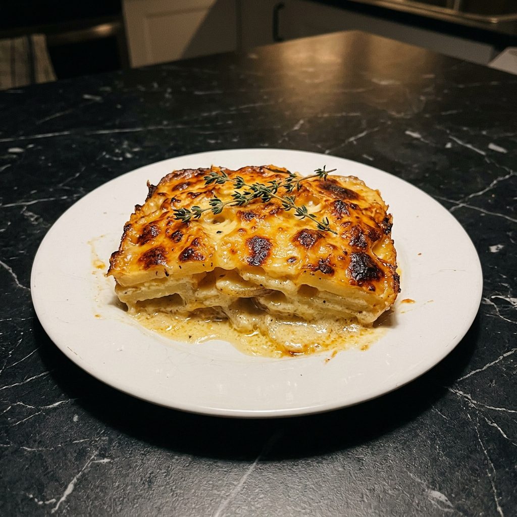Yukon Gold potatoes give you the creamiest most buttery result — they hold their shape better than russets which can become a little grainy. All cheddar works if you can’t find Gruyère — use an extra sharp variety. Swiss cheese is the closest substitute to Gruyère in flavor. For extra richness add 2 oz of cream cheese to the sauce — it makes it even silkier. Add thinly sliced onion between the potato layers for extra aromatic depth. For a lighter version replace the heavy cream with additional whole milk — the sauce will be thinner but still very creamy.