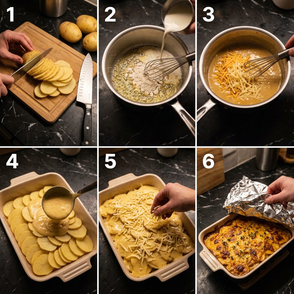 • Make the cream sauce fully before layering — hot sauce penetrates and seasons the potatoes far better than cold