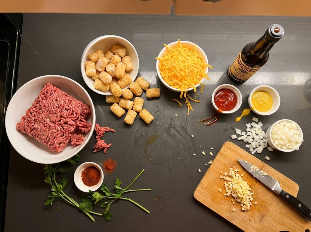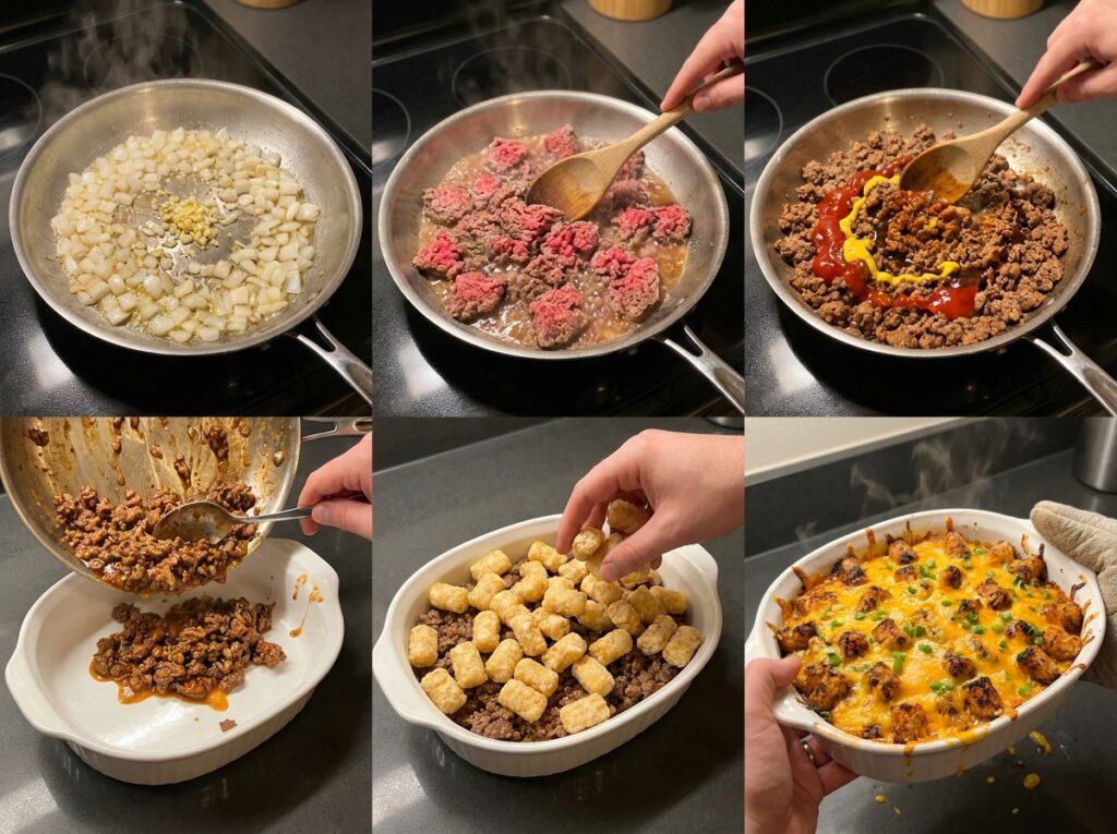 Spread the beef mixture evenly across the bottom of your baking dish. Sprinkle 1 cup of cheddar cheese over the beef. Arrange the frozen tater tots in a single, tight layer on top — pack them in so every inch is covered.