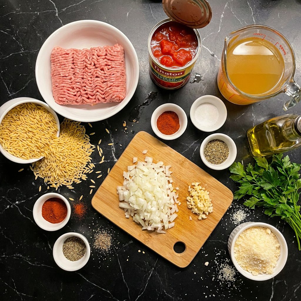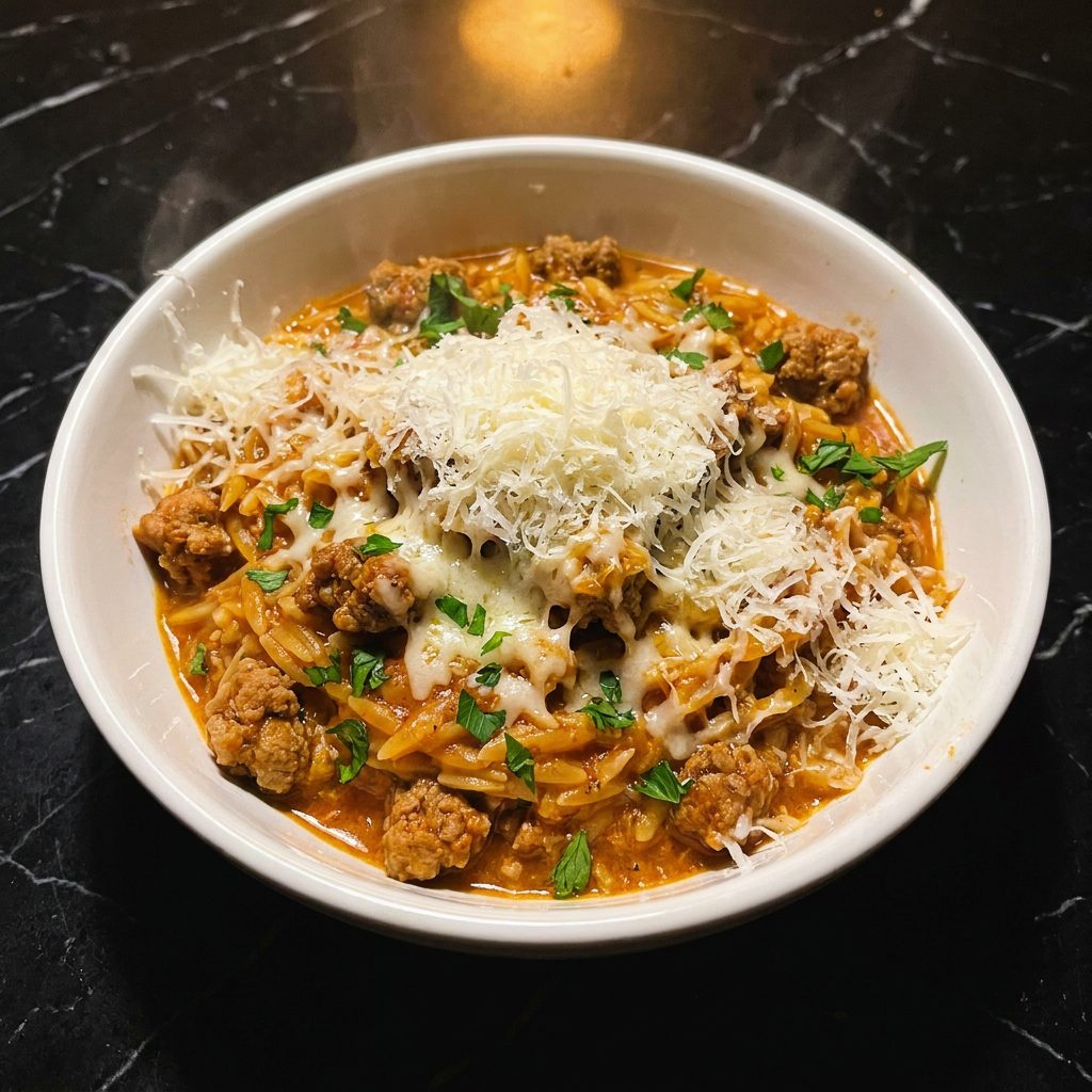 The genius of this recipe is that the orzo cooks directly in the seasoned broth alongside the turkey — which means every tiny grain of pasta absorbs that incredible savory tomato flavor as it cooks instead of just sitting in plain water. By the time the liquid is absorbed the orzo is creamy, tender, and packed with flavor all the way through. The Parmesan stirred in at the end takes it from great to absolutely luxurious.