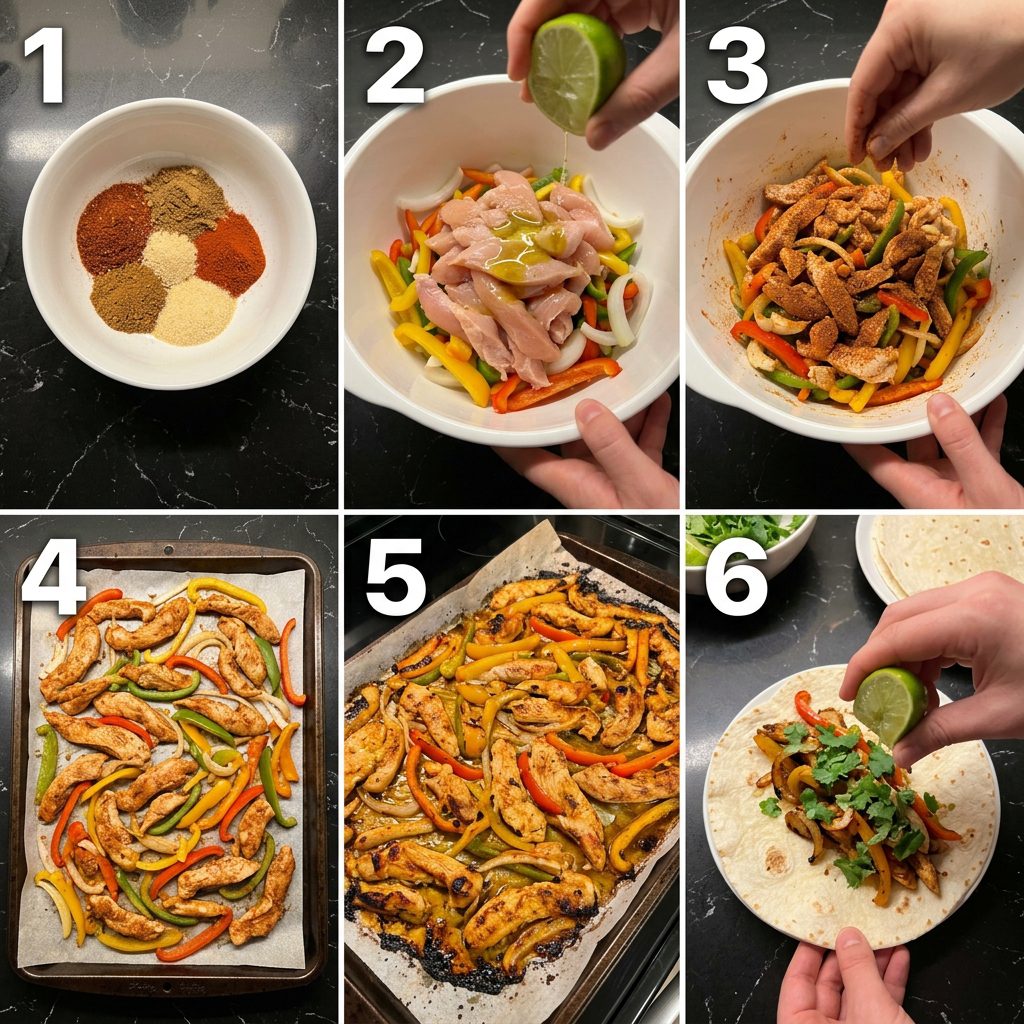 Preheat your oven to 425°F (220°C) — a very hot oven is essential for getting that gorgeous caramelization on the peppers and chicken. Line your baking sheet with parchment paper for easy cleanup. Slice the chicken into strips, slice the peppers and onion thin, and mix all the fajita seasoning ingredients together in a small bowl.